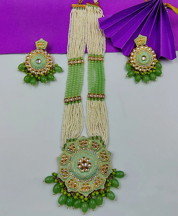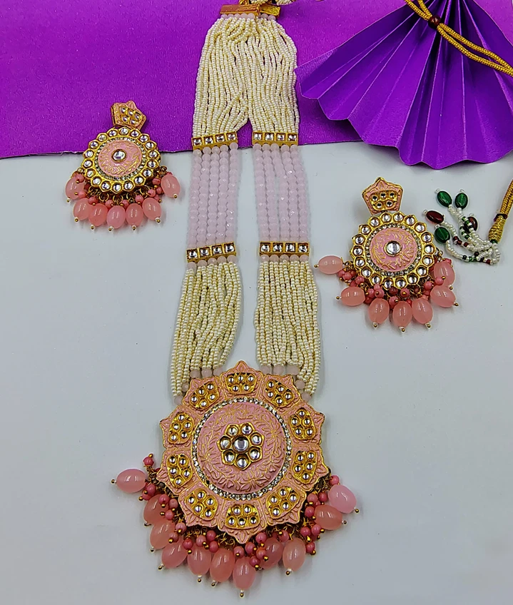 Add timeless elegance to your jewellery collection with this Exquisite Kundan Meena Flower Shape Pendant Necklace Set from Crazyhoor. Featuring a stunning floral design, this luxurious long multilayer necklace is adorned with sparkling crystal beads and handcrafted Meenakari work, creating the perfect blend of tradition and glamour.