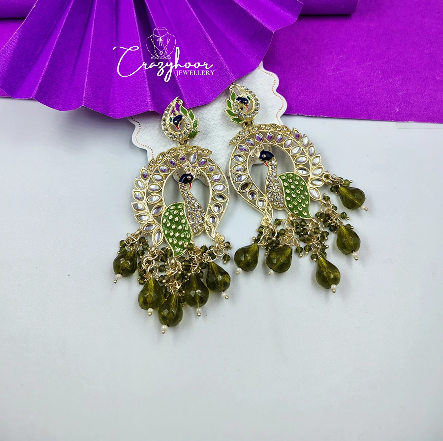 Shop Kundan Beads Drop Chand Bali Earrings in Mehandi Green & Deep Purple at Crazyhoor. Handcrafted elegance with intricate detailing – perfect for weddings & festive looks.