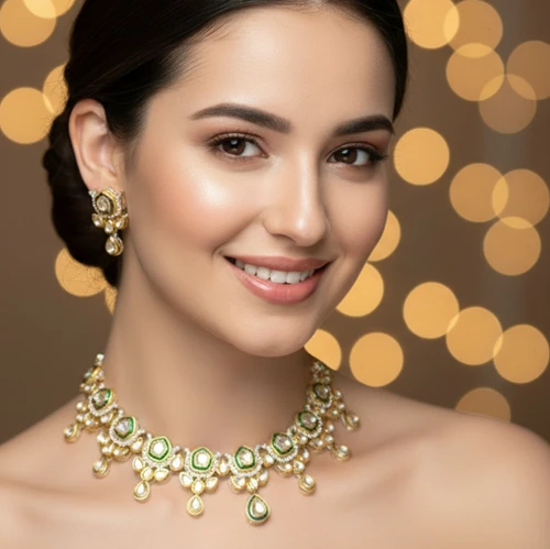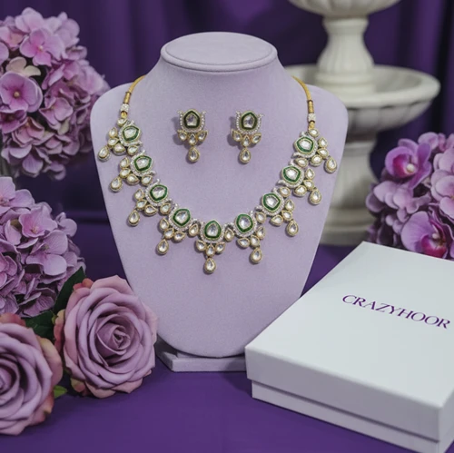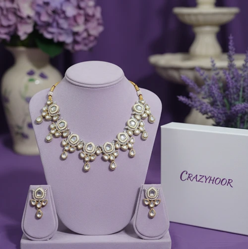 Is set mein delicately crafted high-quality AD stones aur classic kundan detailing use ki gayi hai, jo soft shine ke saath ek graceful look deti hai. Matching earrings ke saath, yeh set shaadi, reception, festive events aur parties ke liye ideal choice hai.
